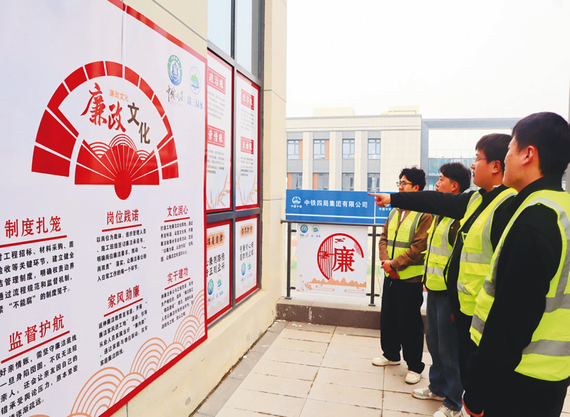 年初以来,中铁四局三公司天津生态城46号地块项目部以廉洁文化建设为抓手,打造廉洁文化墙,内容主要结合关键岗位人员廉洁风险开展靶向教育,着力筑牢项目廉洁堤坝。图为组织青年员工学习。 冯昶 皮强 摄影报道
