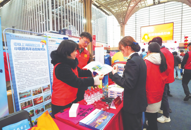 3月5日,中铁上海局四公司组织青年志愿者参加天津市滨海新区志愿服务活动。图为志愿者向行人宣介企业青年志愿服务队事迹。 胡育松 摄