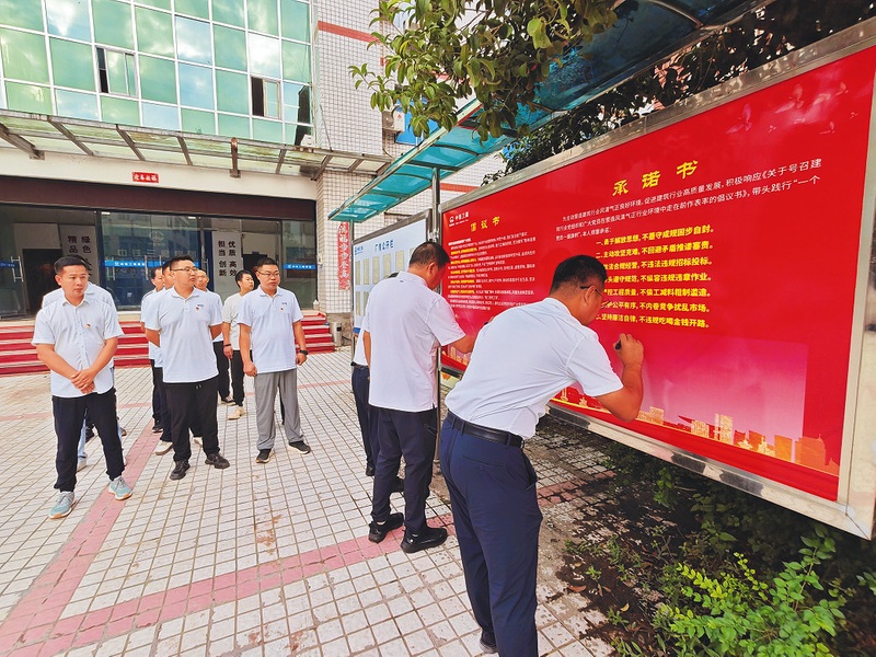 《关于号召建筑行业党组织和广大党员在营造风清气正行业环境中走在前作表率的倡议书》发布后,中铁三局桥隧公司党委积极响应,精心组织各单位宣贯倡议书,引导员工积极响应倡议、自觉践行倡议,共同营造风清气正的市场环境。图为所属西渝八标项目部组织开展承诺书签名活动。 李冰 摄