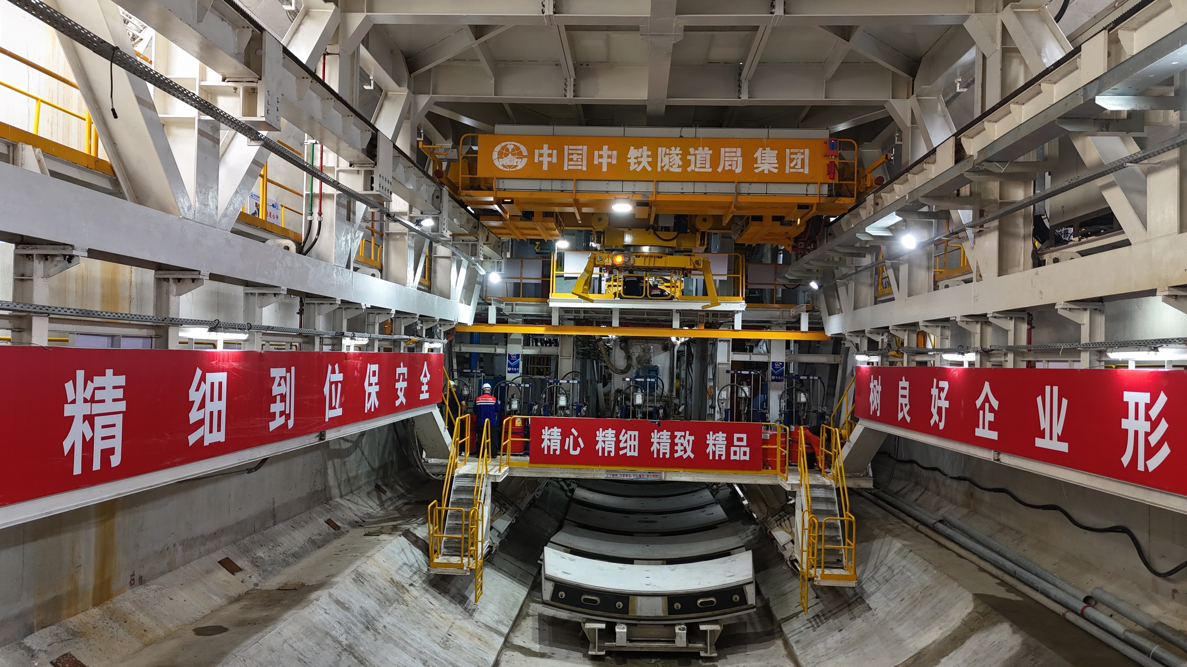 “红船号”盾构机由中国中铁旗下中铁隧道局和中铁工业中铁装备联合研制,刀盘直径14.82米,总长115米,整机重量3986.6吨。针对苏州东隧道极浅覆土始发、超浅覆土掘进和掘进地层以淤泥质粉质粘土为主的特殊地质条件,“红船号”盾构机进行了深度智能化定制,内部集成了中铁隧道局和隧道掘进机及智能运维全国重点实验室自主研发的“智能掘进脑”系统,并搭载行业领先的同步注“水泥-水玻璃”双液浆系统,实现盾构掘进地表及管片上浮毫米级控制。“智能掘进脑”系统让“红船号”盾构机可以进行弧形件智能拼装、智能感知、超前地质预报等多个智能化运行,实现“参数自决策、操作自执行”智能掘进,推动隧道建设实现从“经验驱动”到“数据驱动”突破。