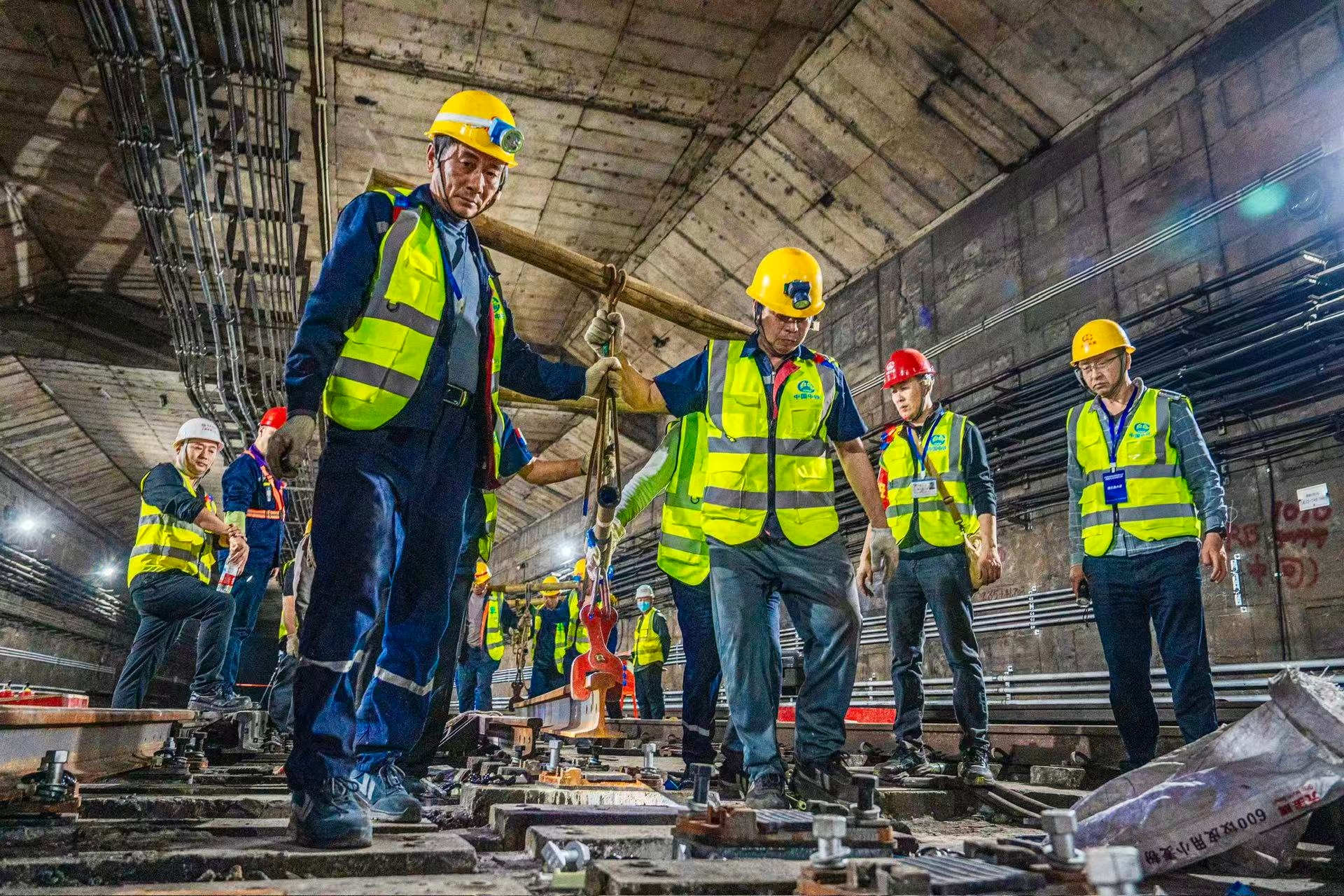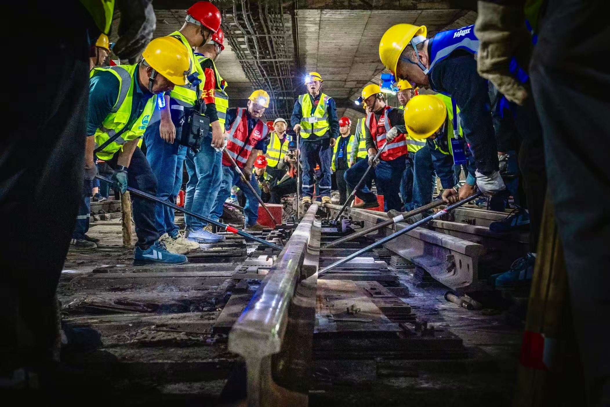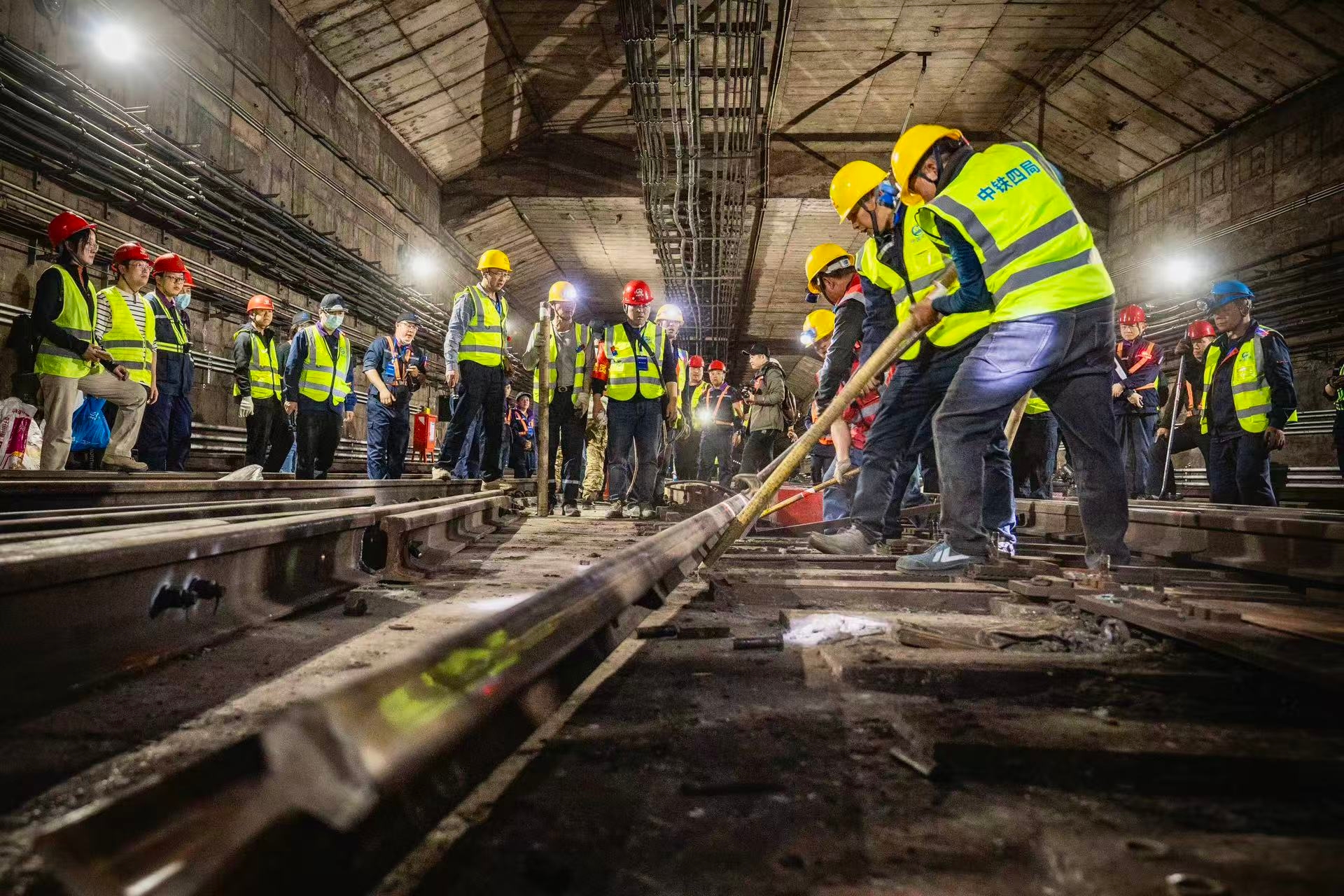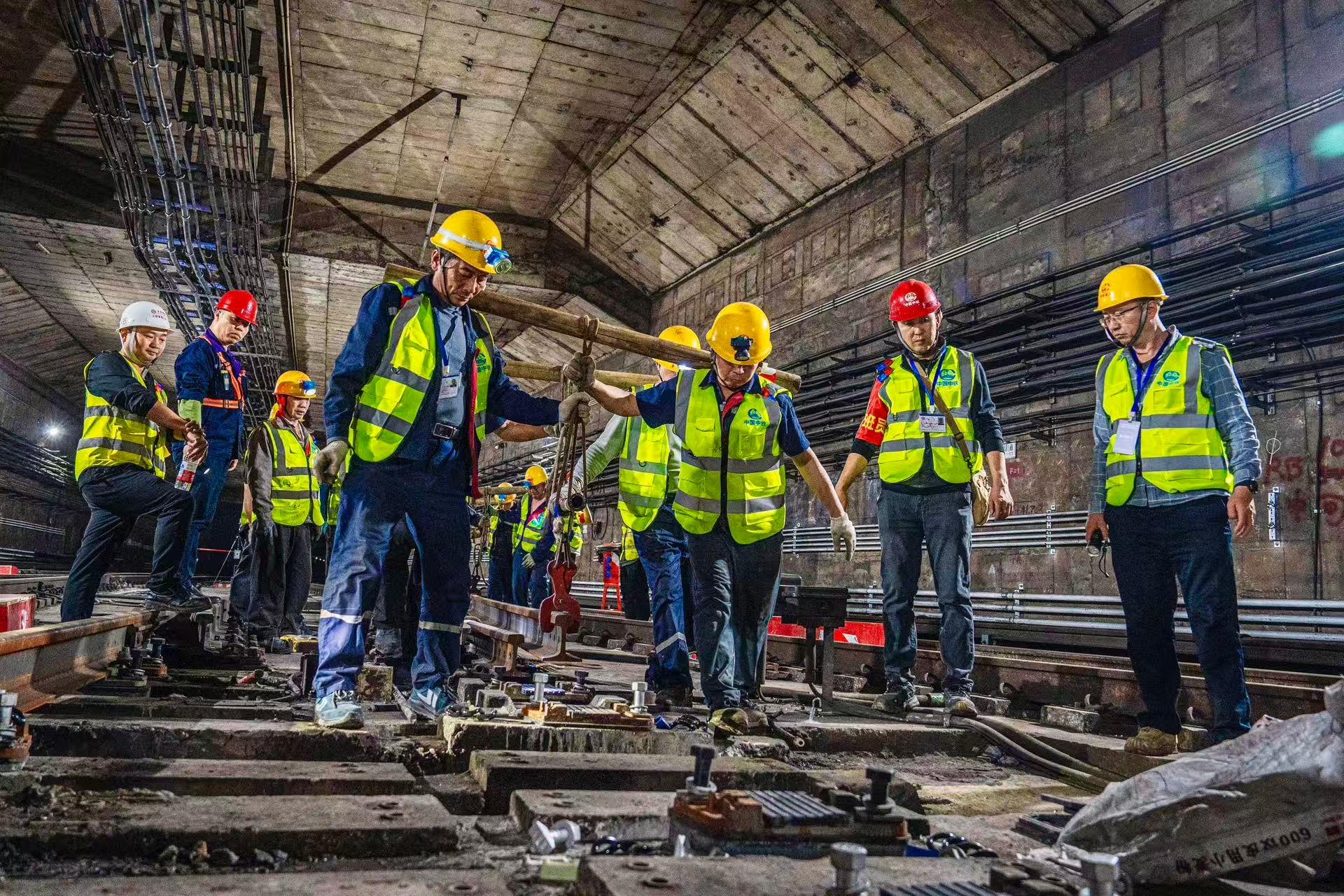 “为配合建国门站道岔设备施工改造,北京地铁1号线建国门站、东单站、永安里站临时封闭。请您合理安排出行,感谢您的理解与配合。”10月18日22时,随着站内广播声最后一遍响起,列车较往日提前停止运行。在收到接触轨断电的通知后,中国中铁旗下中铁四局110余名施工作业人员身穿反光背心,开启爆闪肩灯,脚踩绝缘鞋,顶戴安全帽、头灯,开始了持续8小时的道岔改造紧张施工。