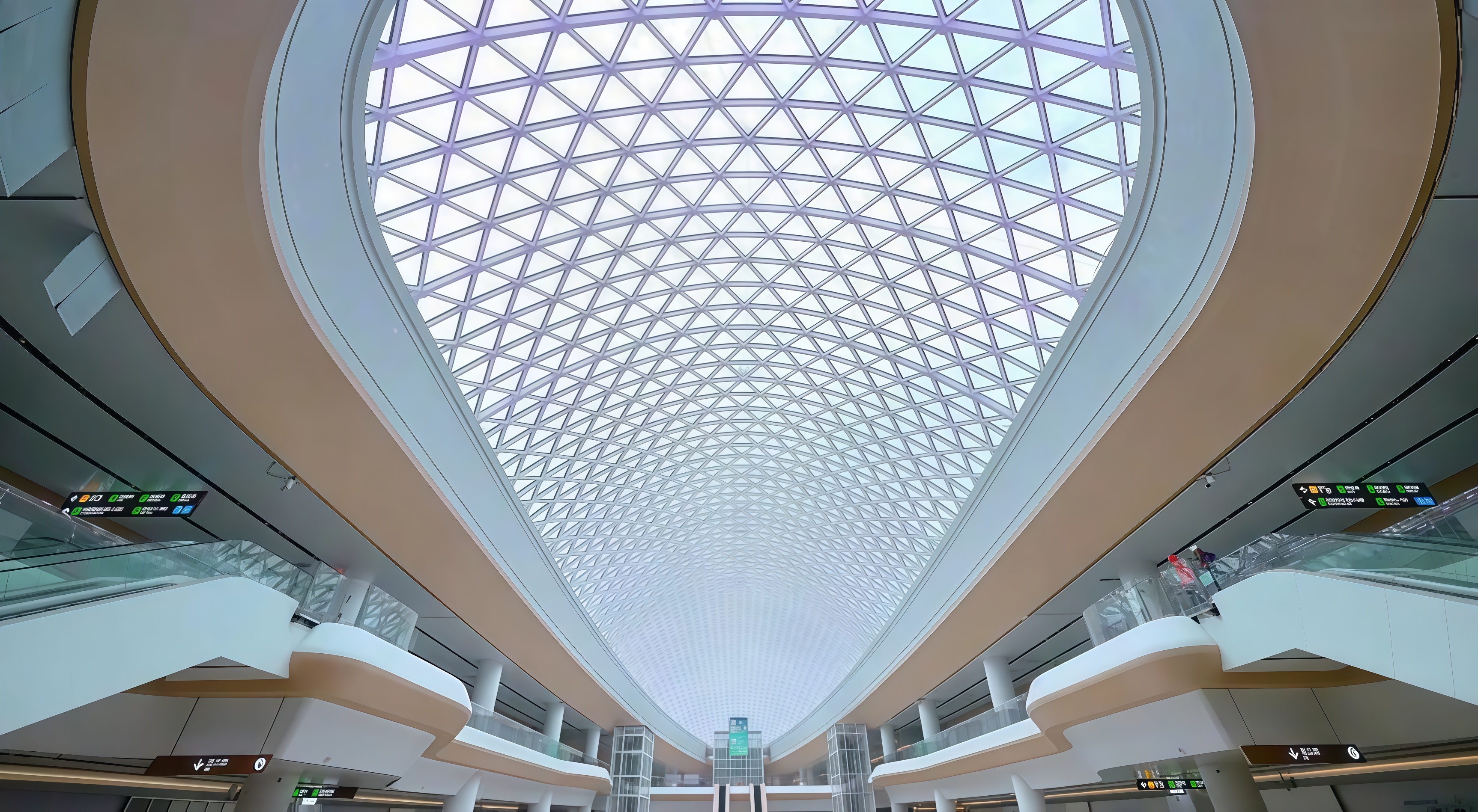 据项目技术负责人介绍,该工程最大亮点是交通中心上方5000平方米的采光穹顶,以“木棉花开 九天银河”为设计理念,长约174米,最大跨度32米,为拱形网壳结构,由1222个圆毂和3878件方管杆件构成。项目团队还匠心打造具有地标意义的大型水族馆,其以“羊城花冠,海润连城”为设计理念,意在打造山海贯通、绿意盎然的岭南空港,让旅客在进出港途中体验从海洋到花海的沉浸式旅程。该水族馆为目前全球最大的椭圆形全透亚克力水族箱体,将于2026年9月正式投入运营,届时将申请有关世界纪录。同时,作为国内首个引入ICS行李系统至轨道站厅层的交通中心,为方便旅客出行,项目在地下二层设有自助式值机和行李托运系统,未来预计43%通过轨道交通出行的旅客可以实现分散就地值机和行李托运。