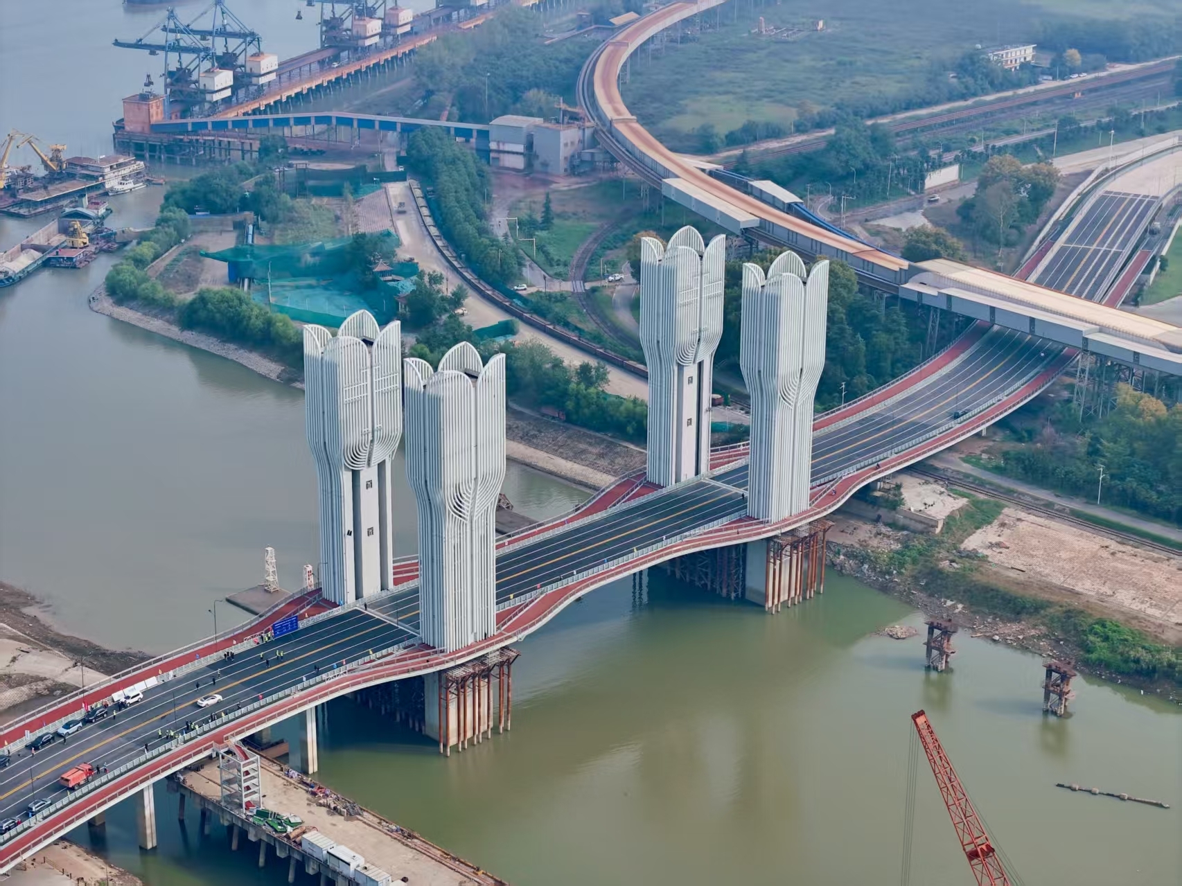 右岸大道跨越武钢工业港河桥梁设计为升降式开启桥,是湖北乃至中部地区首座开启桥,全长737米、跨径104米、桥面标准宽度31米(塔柱断面最宽处46.2米)、提升重量约2650吨(相当于把黄鹤楼拔地而起)、提升高度27米。该桥的长度、宽度、提升高度及重量在同类型开启桥梁中均处于领跑地位,居亚洲第一。大桥搭载4个卷扬提升设备,仅需9分钟便可将桥面升至27米高空,相当于9层楼的高度。中铁工业中铁重工负责该桥桥塔装饰、提升设备以及防撞设施安装调试等工作。
