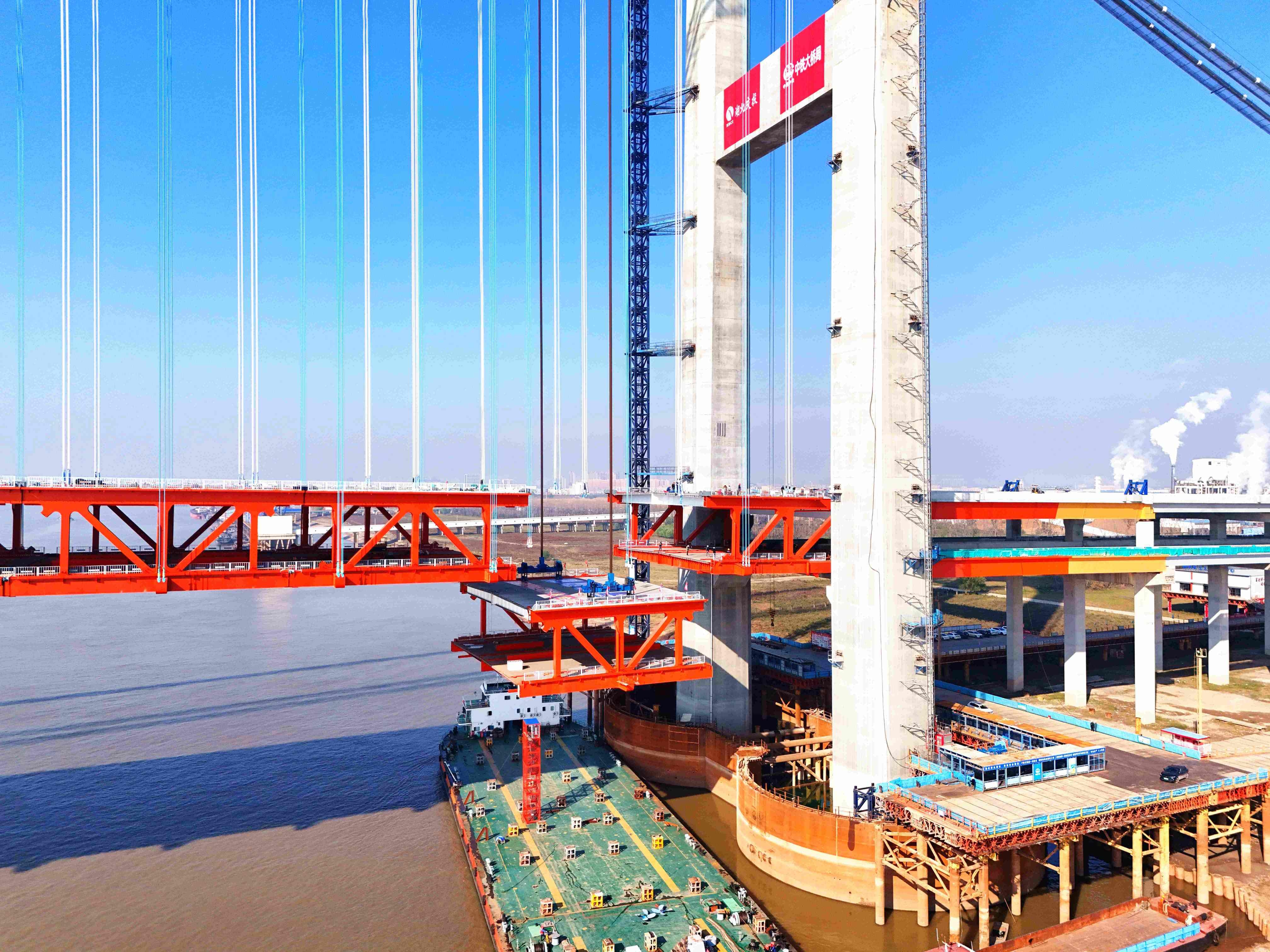 燕矶长江大桥位于鄂黄长江大桥下游6.5公里处,是鄂黄第二过江通道的重要组成部分。项目全长26.391公里,上层设计为高速公路,下层为城市快速路。桥位距离鄂州花湖机场仅5公里,考虑到塔高受限、航道需求、生态红线及桥位地质条件影响等因素,大桥设计为主塔高仅184米的双塔单跨且一跨过江桥梁,垂跨比也达到了千米级悬索桥中前所未有的1:15。为解决这一结构难题,建设团队采用了不同垂度四主缆双层悬索桥结构体系,其同侧主缆高度、长度、垂度均不同,以此分散荷载,并提高桥梁的稳定性,且优化了索鞍及主缆规模,使主缆受力更合理。全桥钢梁共69节段,从跨中向两岸同步对称架设,单片钢梁重约830吨,中铁大桥局采用自主研制的900吨缆载吊机架设钢梁。