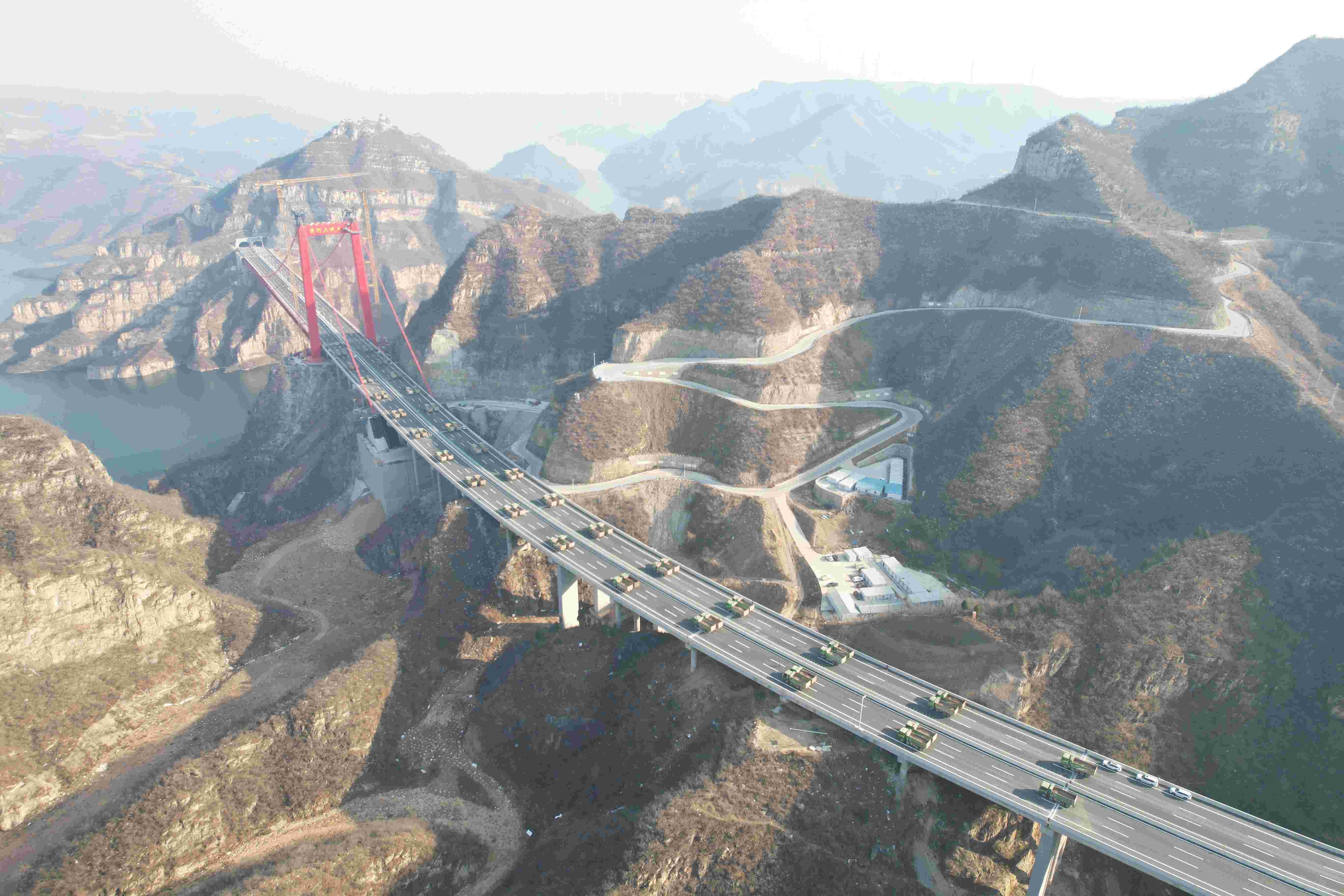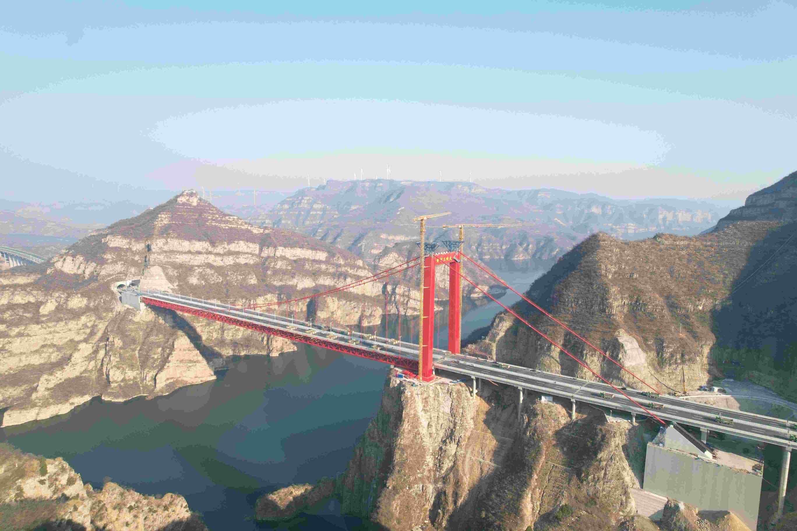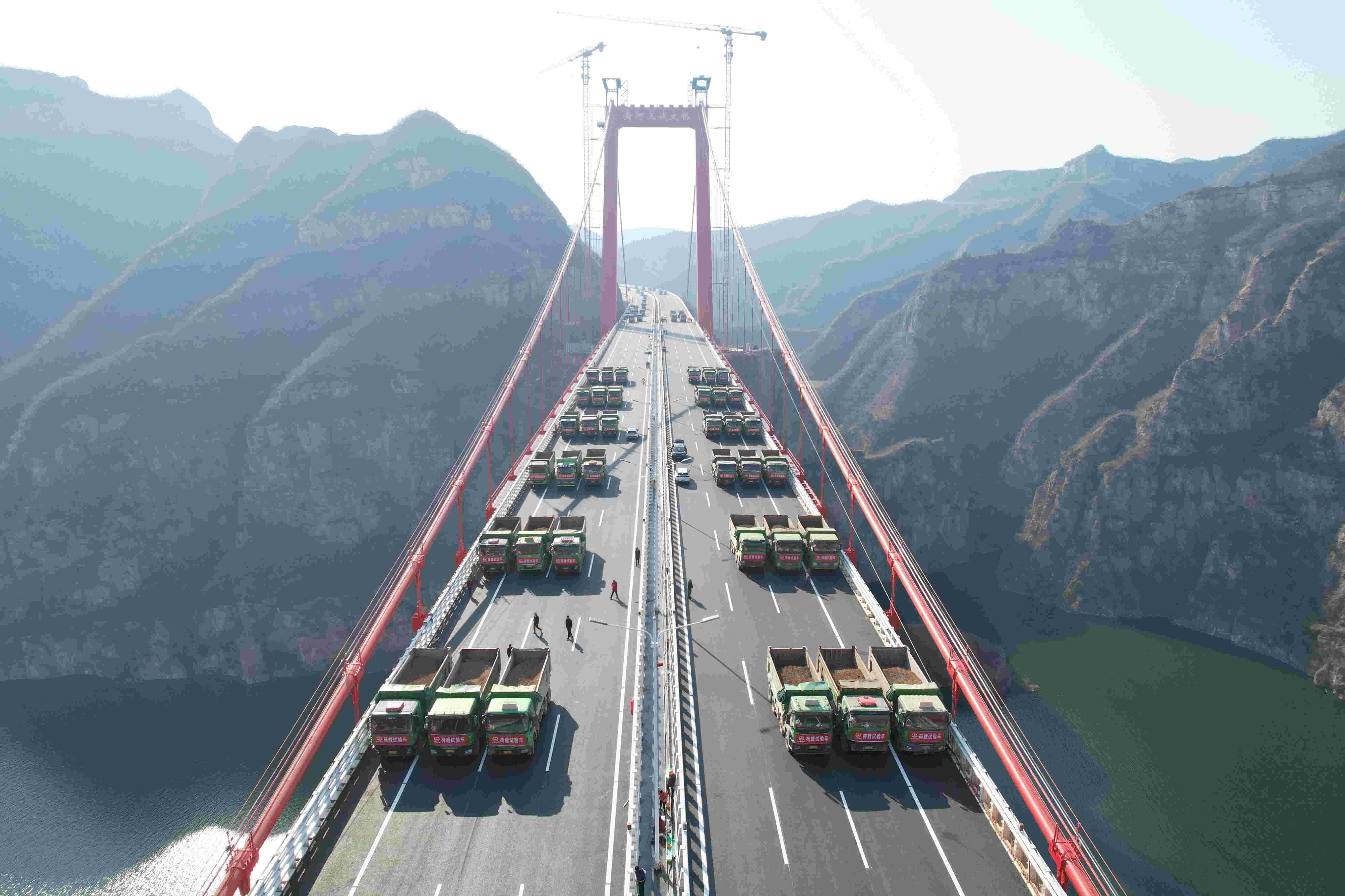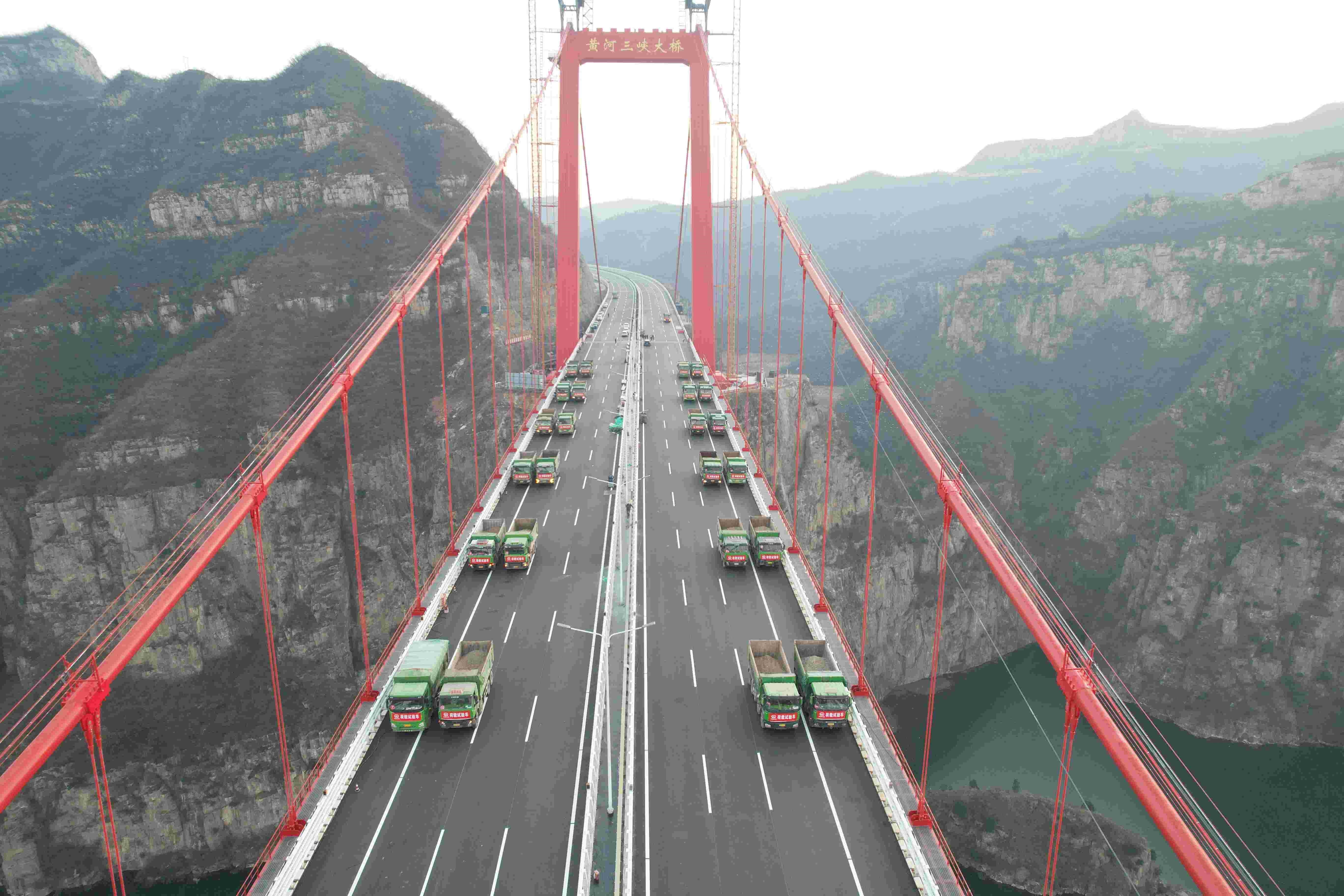 12月5日,中国中铁旗下中铁四局承建的世界首创独塔地锚式回转缆悬索桥——黄河三峡大桥,完成荷载试验。