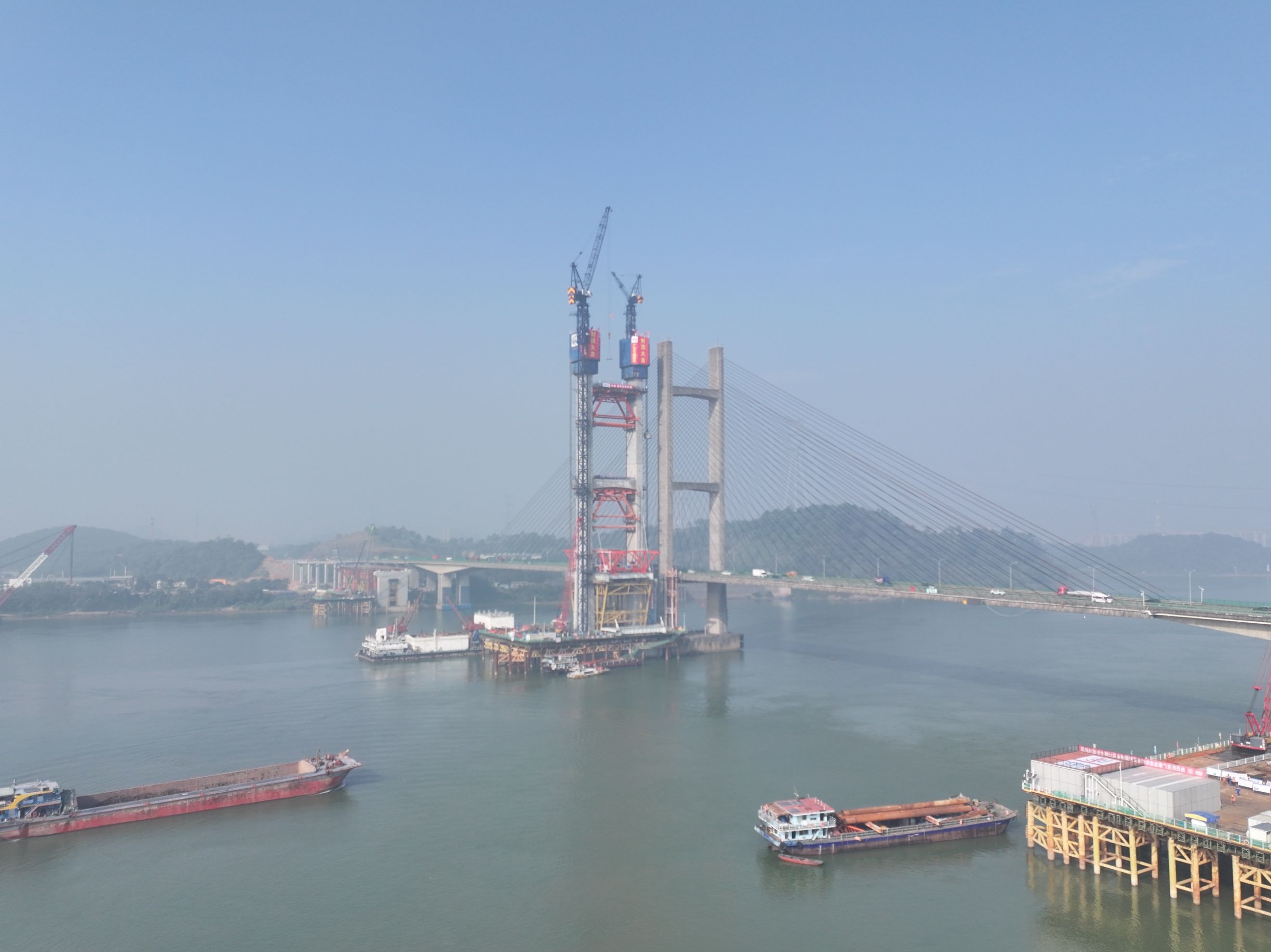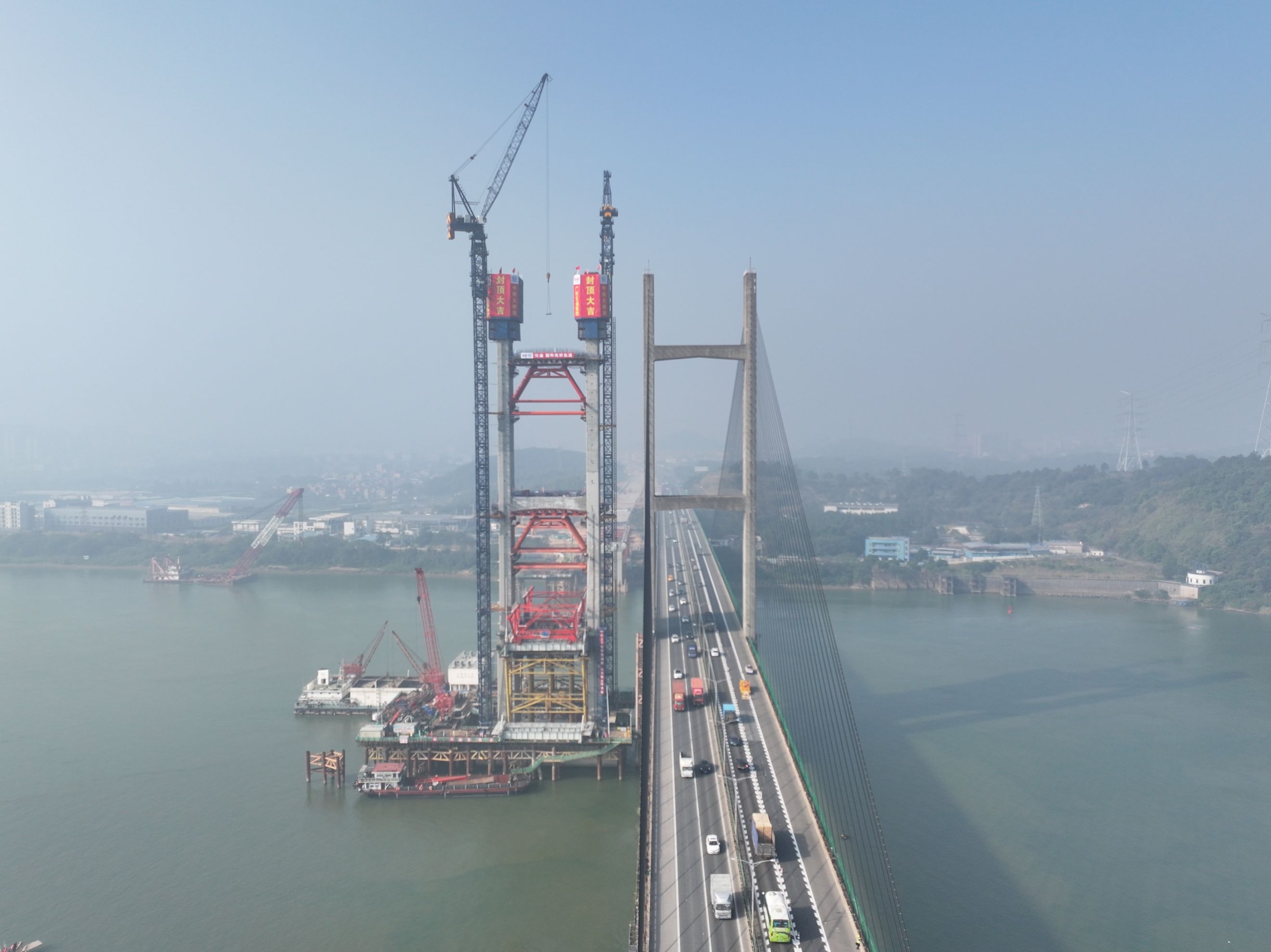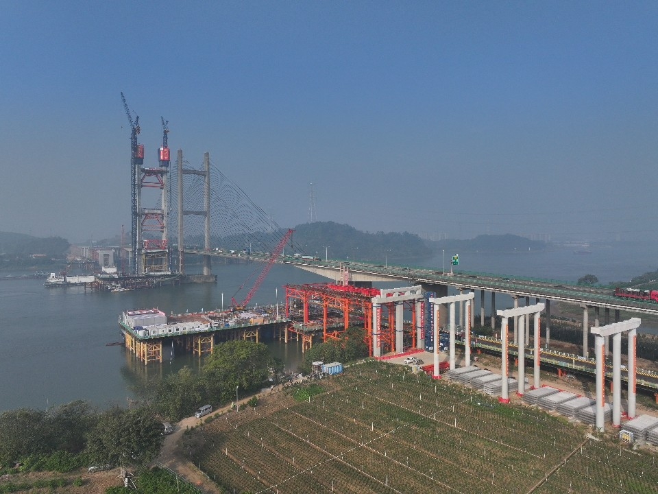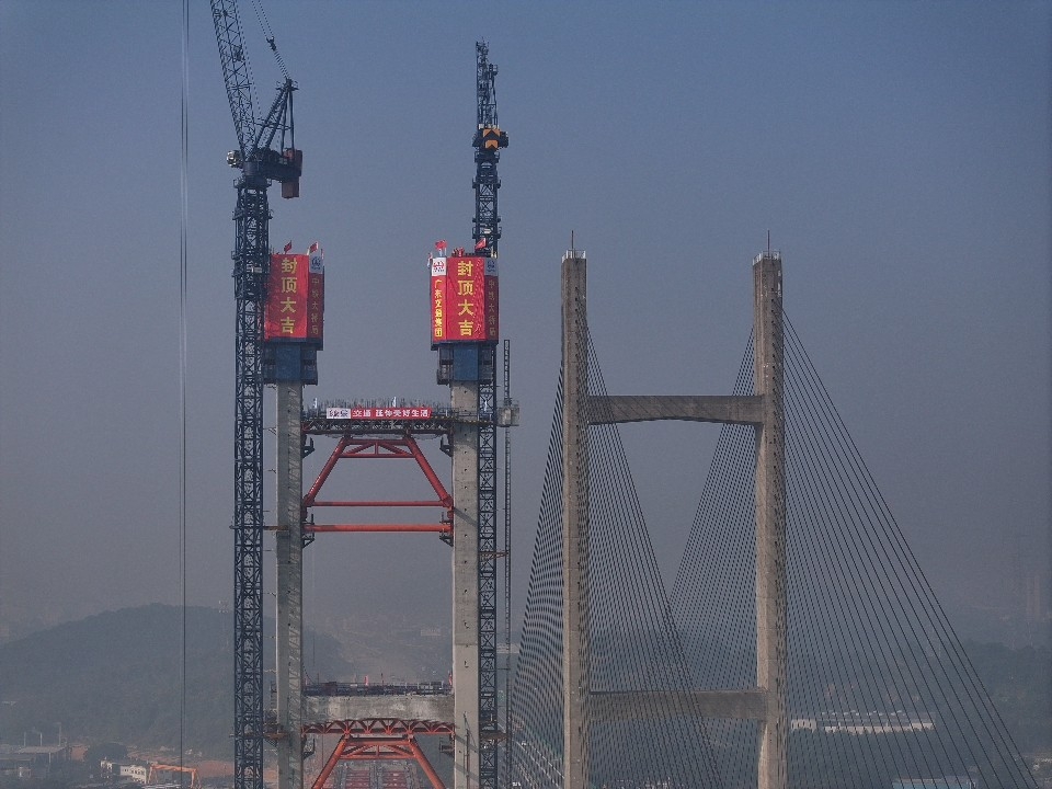 12月24日,中国中铁旗下中铁大桥局承建的广(州)肇(庆)高速公路改扩建项目关键控制性工程——新建金马大桥主塔封顶。