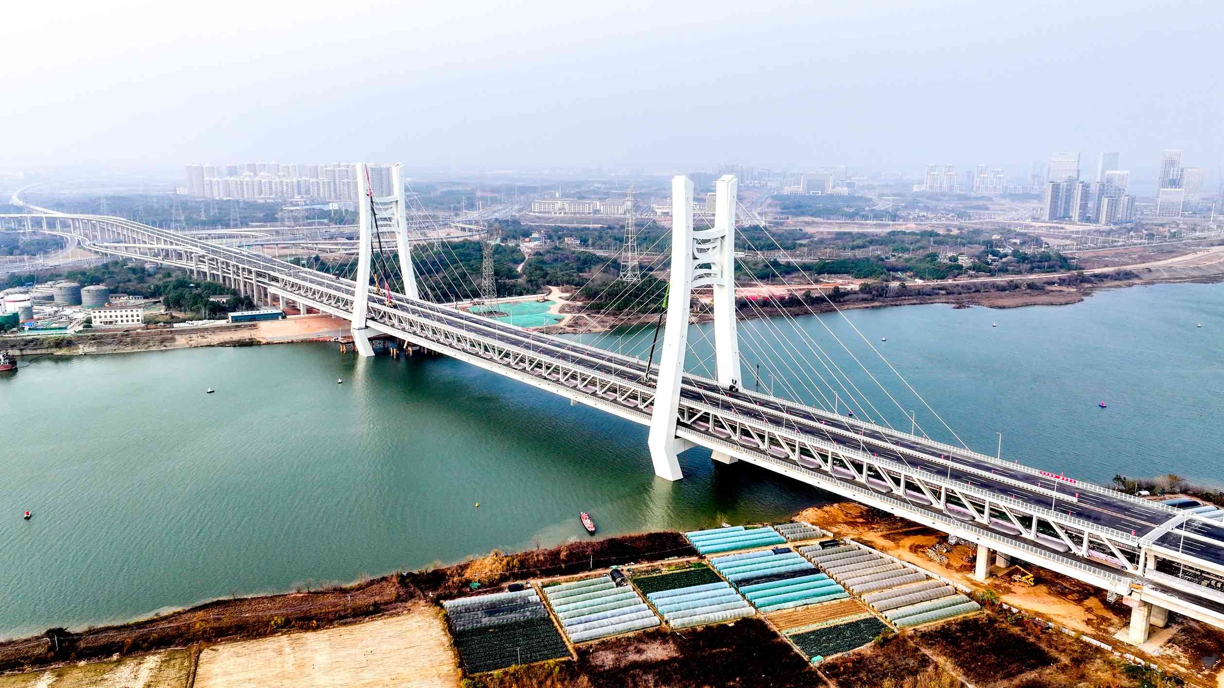 据悉,该桥建成后,将创造6项世界纪录:世界首座集12车道于一体公路车道数量最多及通行能力最大公铁合建桥梁、世界首座320米主跨时速350公里无砟轨道斜拉桥、世界首座时速350公里竖琴形索面斜拉桥、世界首创大挑臂断面的钢桁梁斜拉桥、世界最大直径斜拉索的公铁合建桥梁、世界首座采用弹性约束支座的斜拉桥。(张妹妹)
