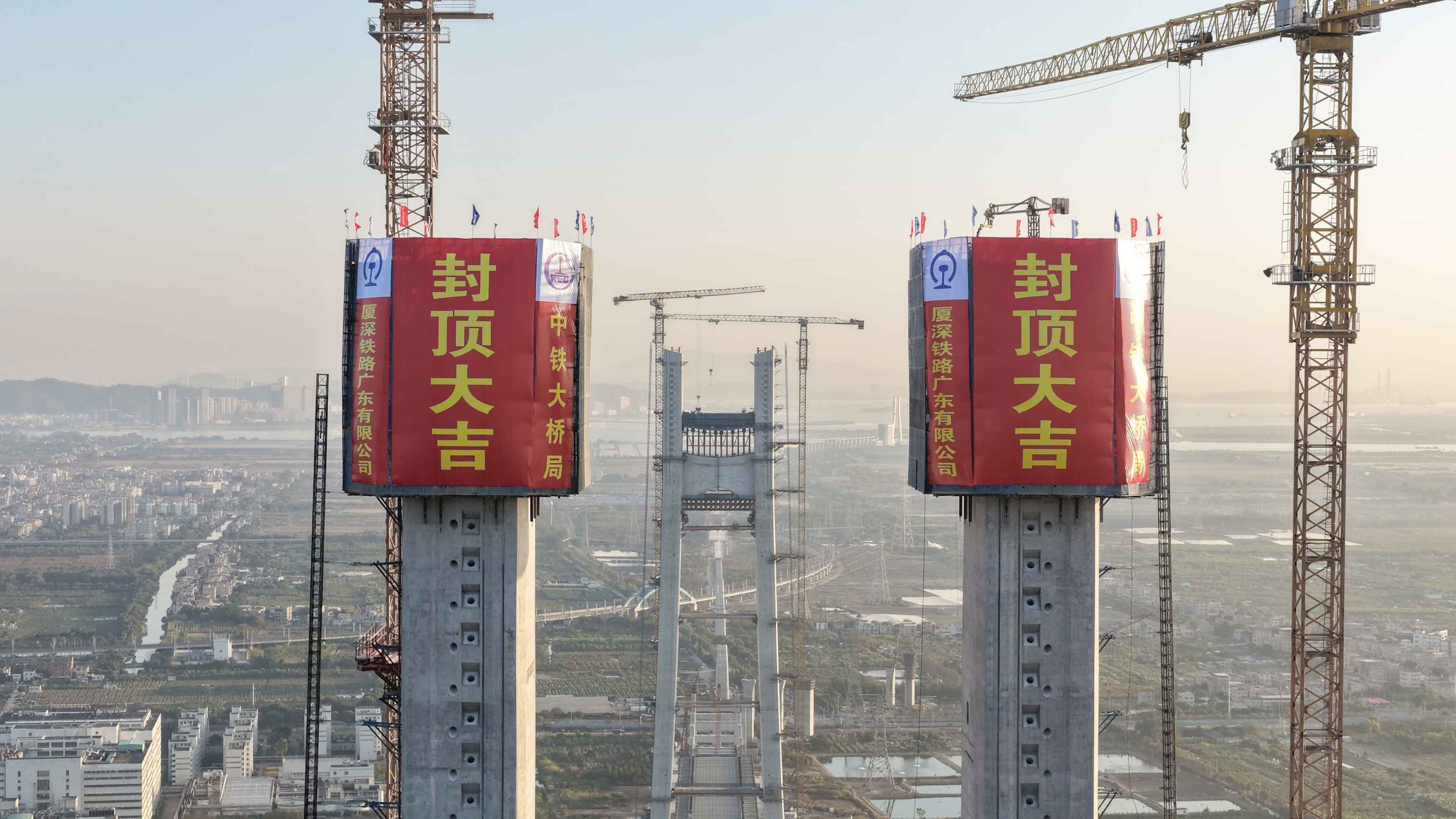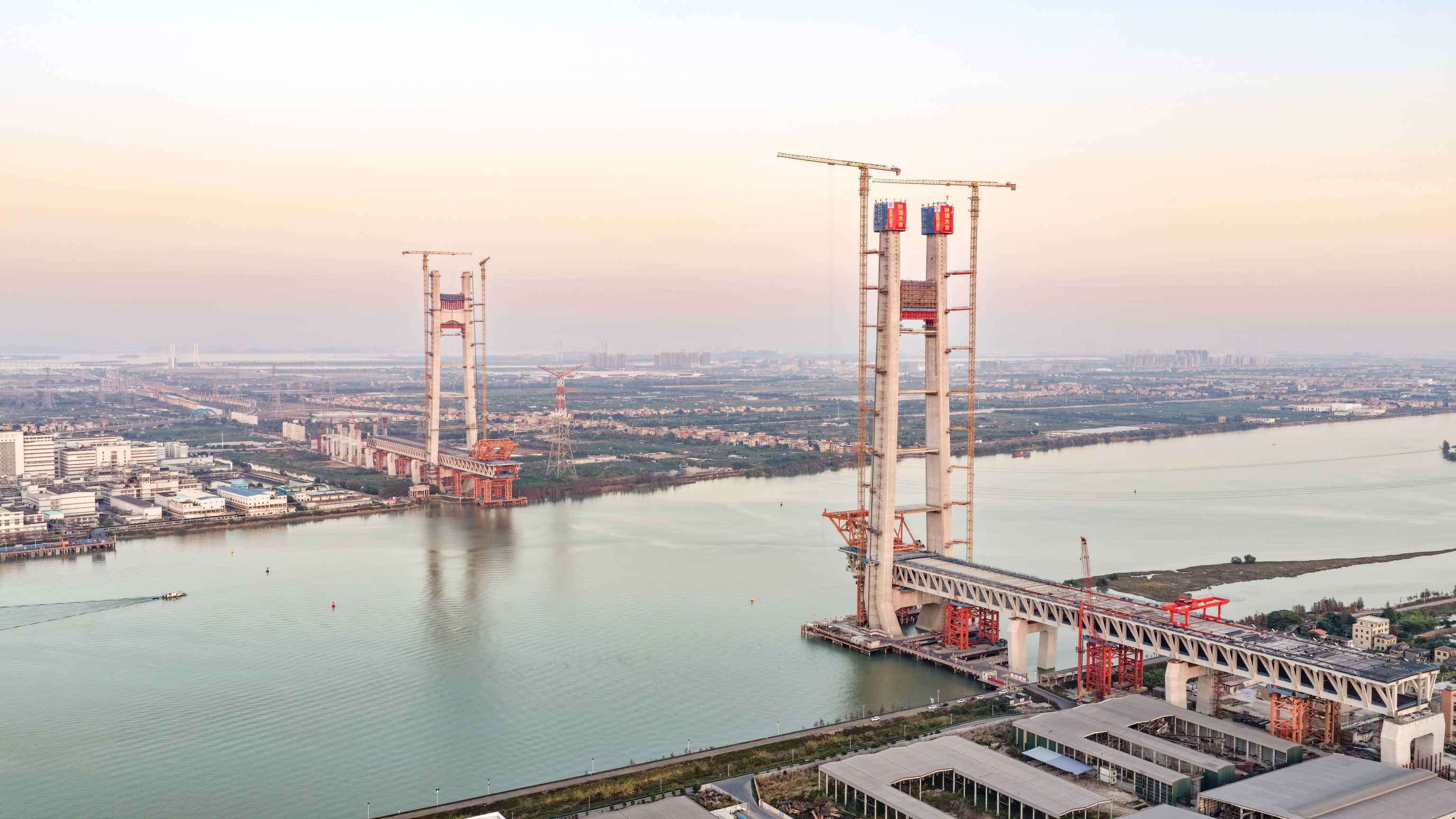 1月11日,中国中铁旗下中铁大桥局承建的深江铁路洪奇沥水道公铁大桥50号墩主塔封顶,至此该桥两座主塔全部封顶。