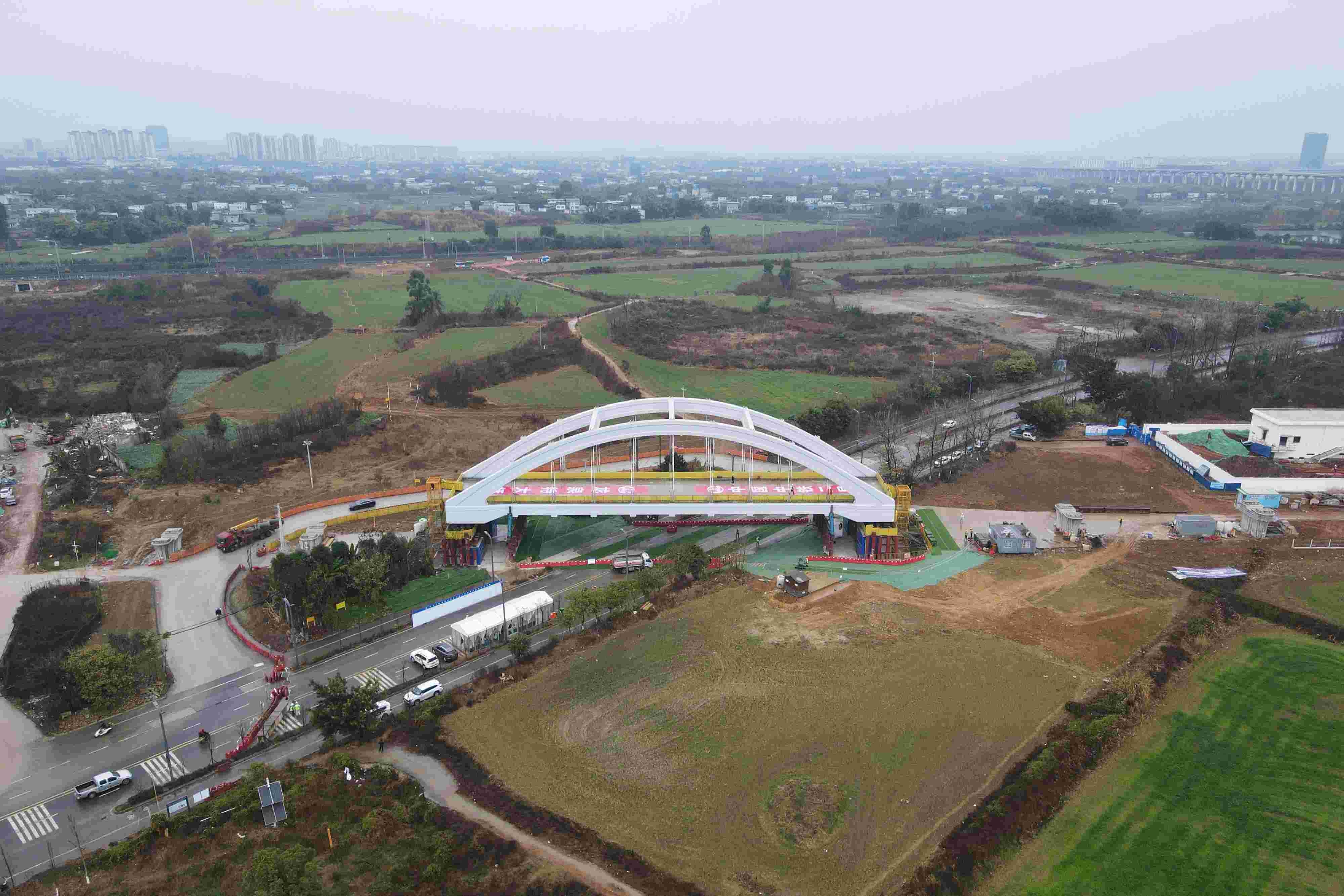 1月26日,经过150个小时的落梁作业,中国中铁旗下中铁二局成渝中线高铁项目团队完成龙泉特大桥6000吨系杆拱就位作业。