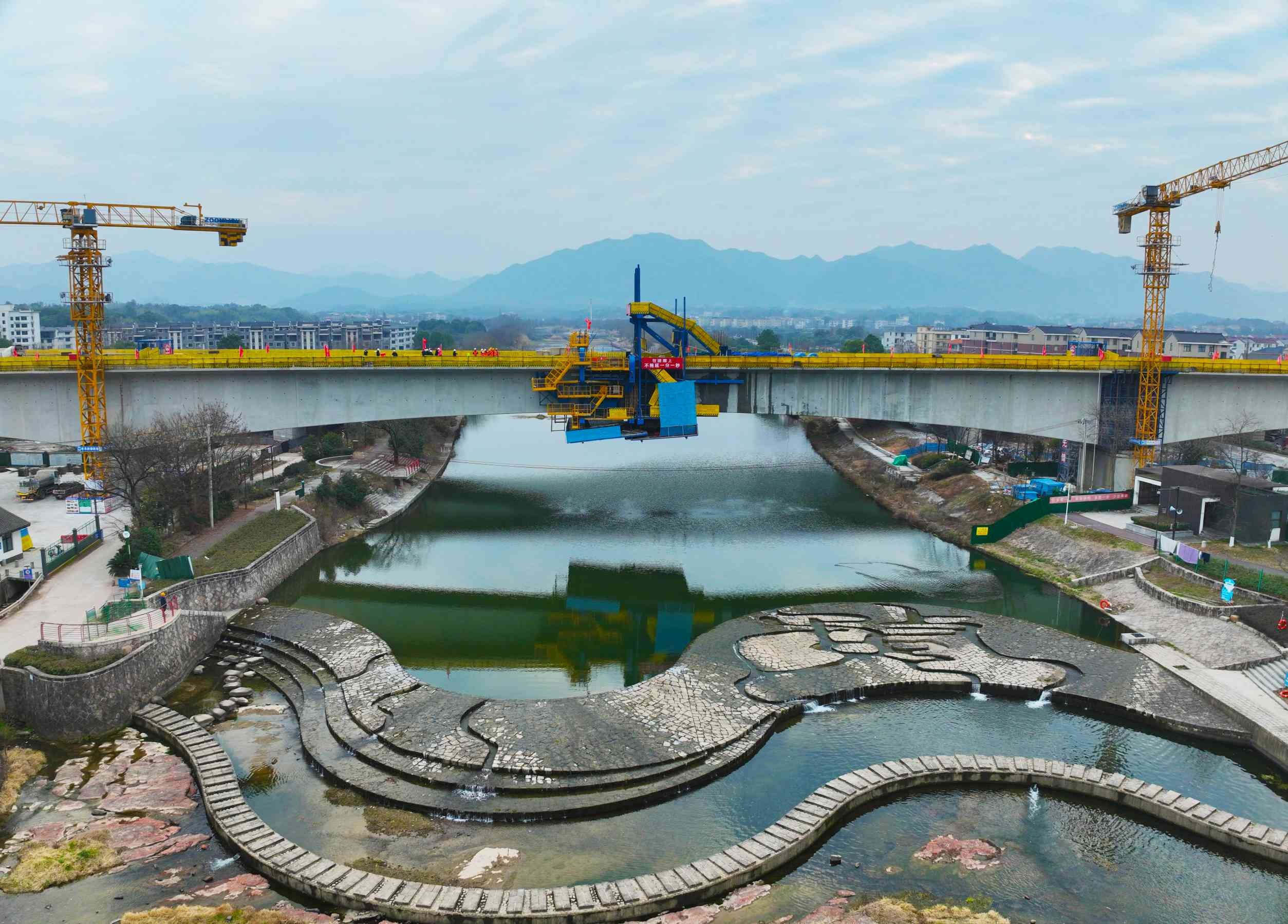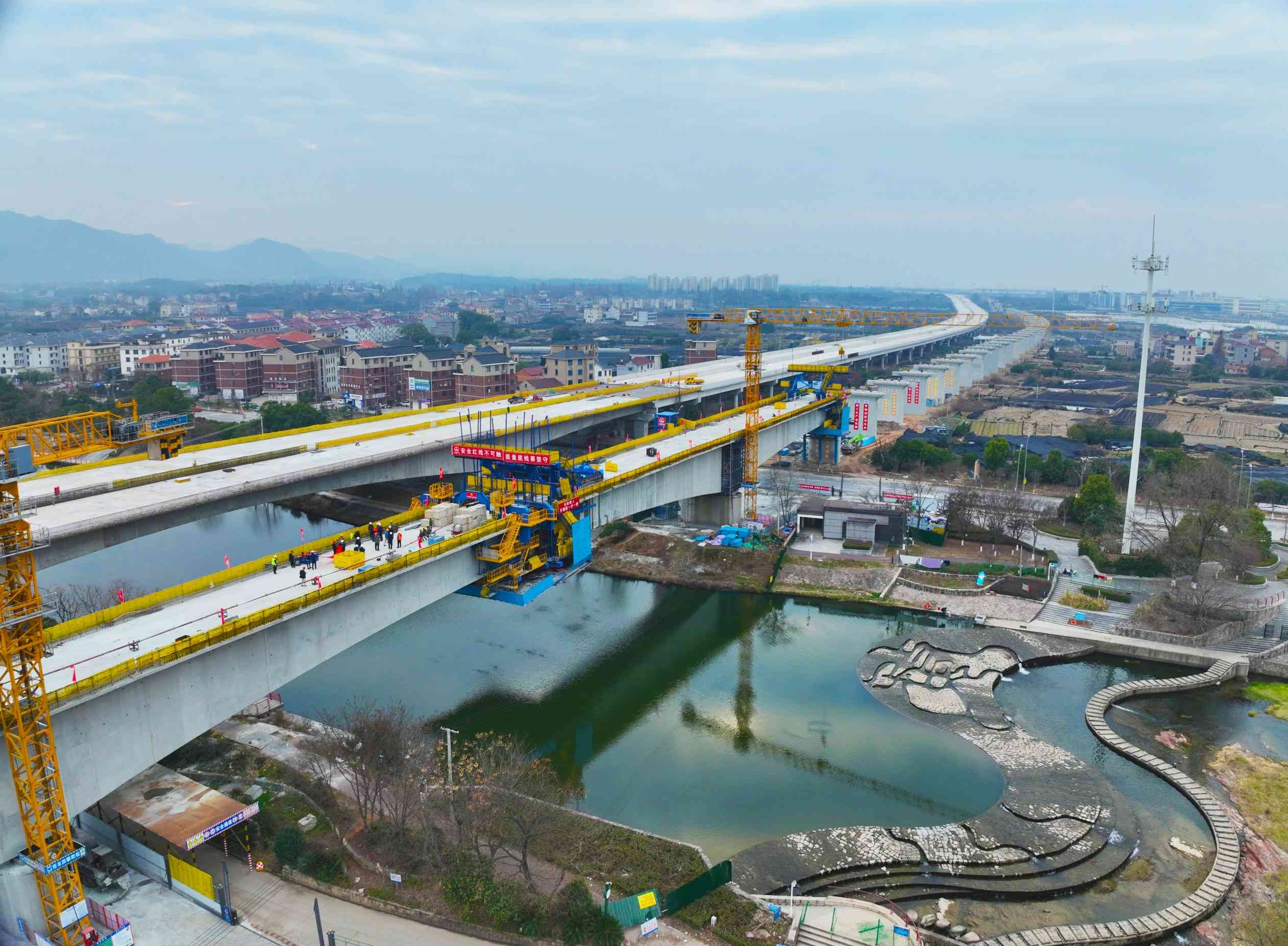 梅溪特大桥位于浙江省金华市苏孟乡,全长2255.7米,跨越梅溪河及金安大道,与甬金衢上高速公路交叉作业。施工过程中面临三重挑战:大桥地处金华市重要水源保护地,施工需严格守护水体生态安全;连续梁跨越金安公路交通主干线,高空作业与地面交通交织导致安全风险增大;连续梁悬臂浇筑过程中,梁体线形控制、温度应力防控等技术难度大。