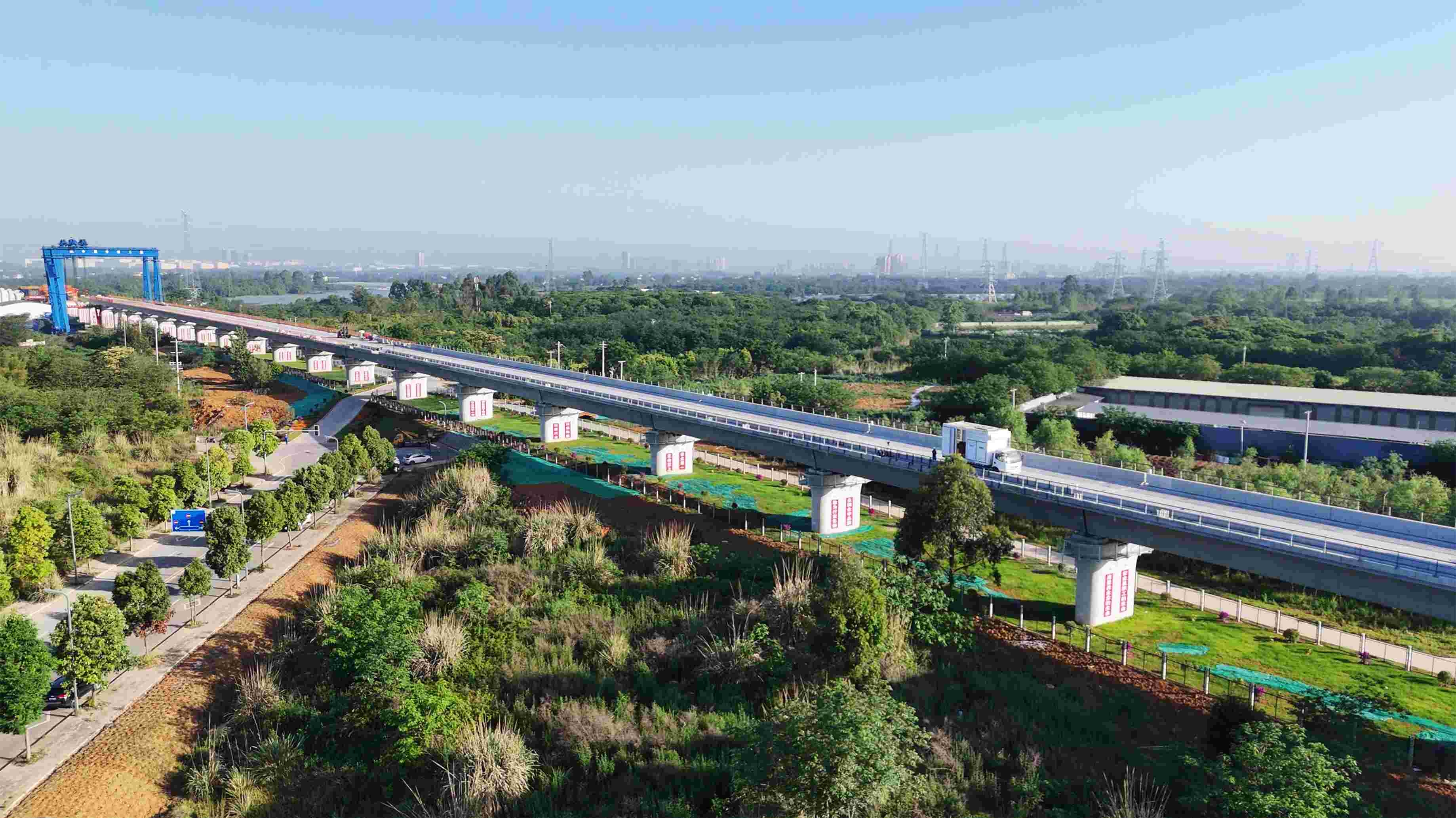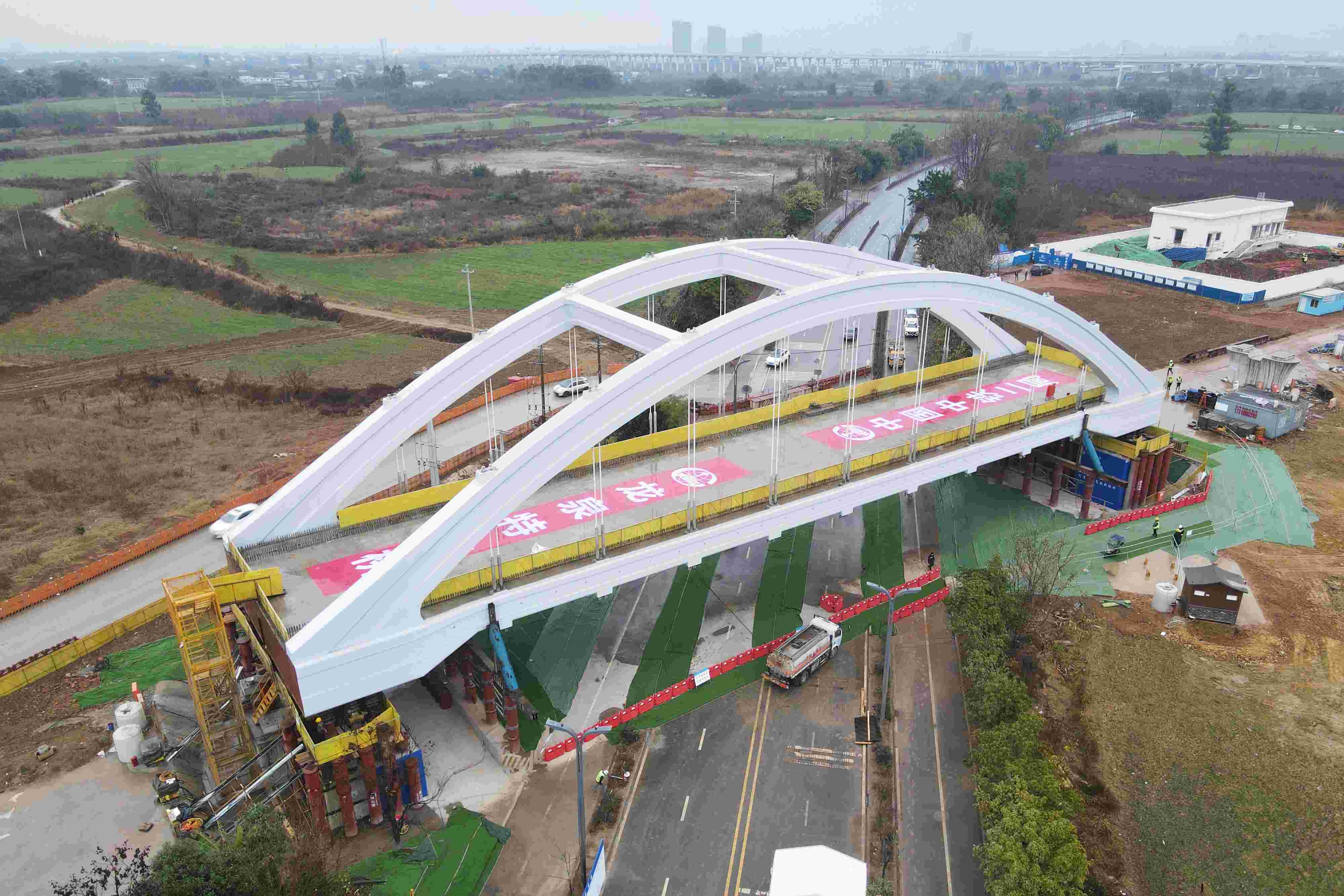 2月3日,中铁二局承建的成渝中线铁路全线最长桥梁——龙泉特大桥合龙,实现全桥贯通。龙泉特大桥东起成都市龙泉驿区洛带镇,西至成华区龙潭街道,全长约14公里,是成渝中线铁路最长桥梁,具有特殊结构多、施工组织复杂等特点。全桥设计10联连续梁、1孔72米系杆拱及379孔预制箱梁。其中跨越成华区新龙石路的72米系杆拱桥为全线技术难度最高的节点工程之一,采用钢筋混凝土结构,桥体重达6000吨,兼具适应大跨度、梁体高度低的特点,配合高位落梁施工工艺,可最大限度保证桥下通行净空,在不中断桥下交通的情况下完成梁体施工。