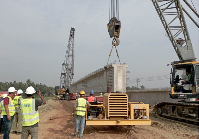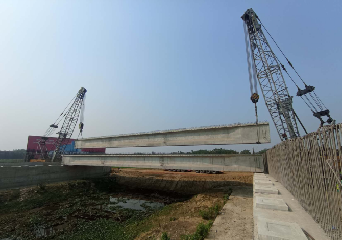 该公路以达卡为起点向北延伸至锡尔赫特,总长度超过200公里,计划将原有的双向两车道升级改造为双向4个主车道,以及道路左右侧各设1个应急车道,设计时速80公里,采用沥青路。中铁一局负责施工的DS-10标段线路全长16.8公里,工程内容包括涵洞23座、桥梁13座等。此次架设的预制梁单重87.2吨。