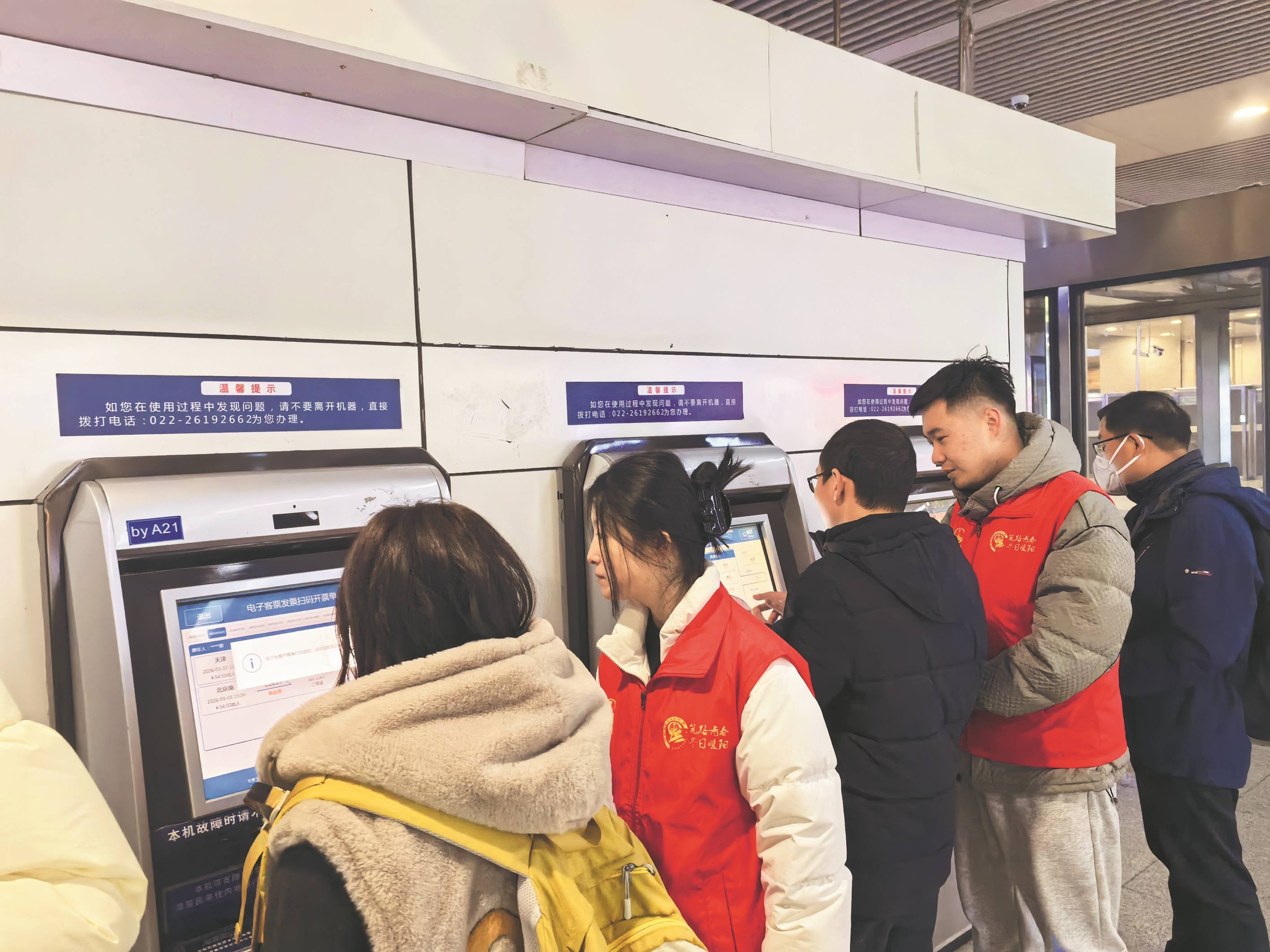 在第63个学雷锋纪念日到来之际,中铁六局天津公司青年志愿者身着红色马甲,走进天津站开展志愿服务活动,受到旅客好评。图为志愿者协助旅客购票、核对行程信息。张欣