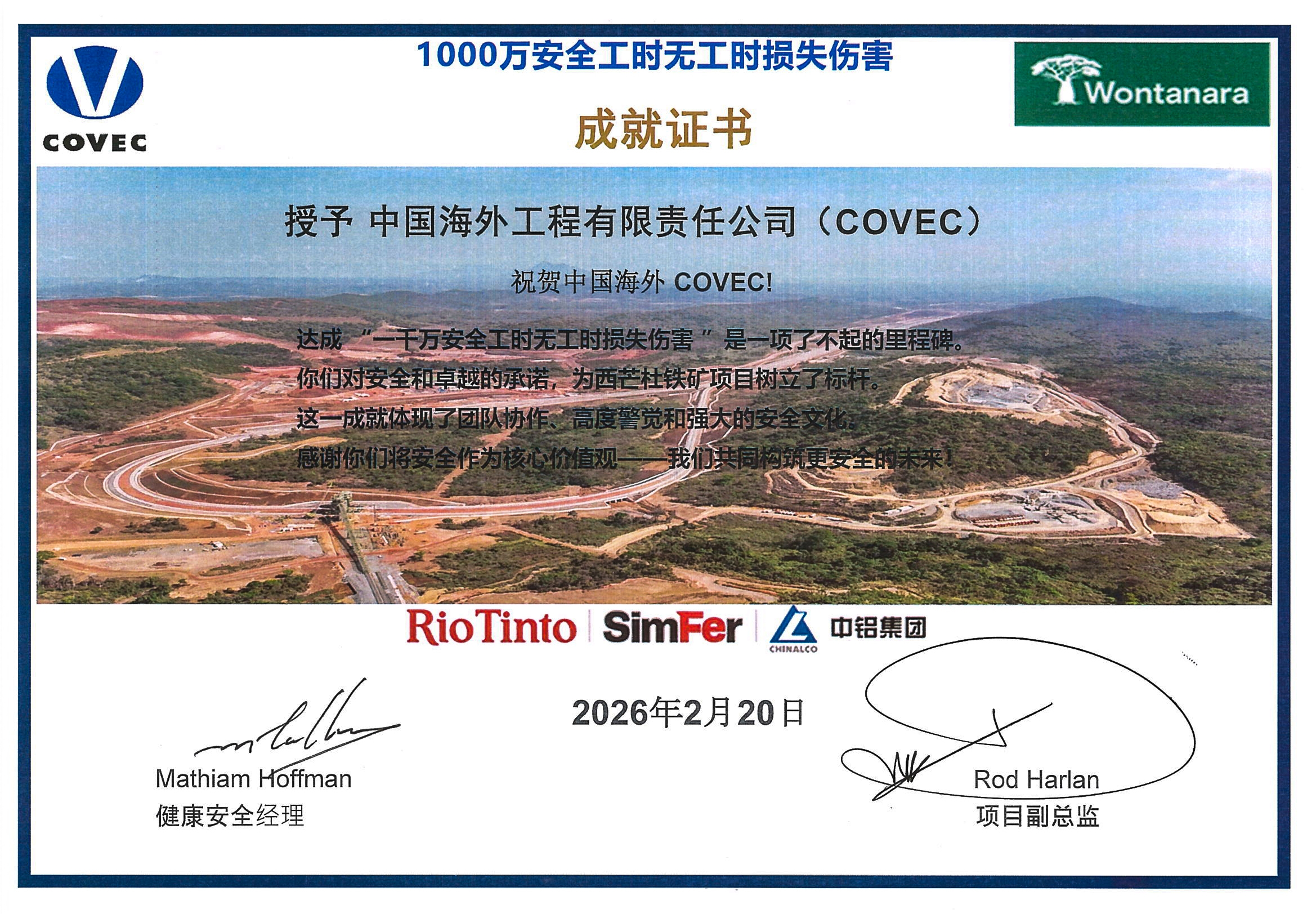 当地时间3月17日,中国中铁旗下中海外荣获几内亚力拓西芒杜项目公司“1000万安全工时无工时损失伤害成就”荣誉证书,成为西芒杜矿区建设中首个达成该安全成就的承包商。