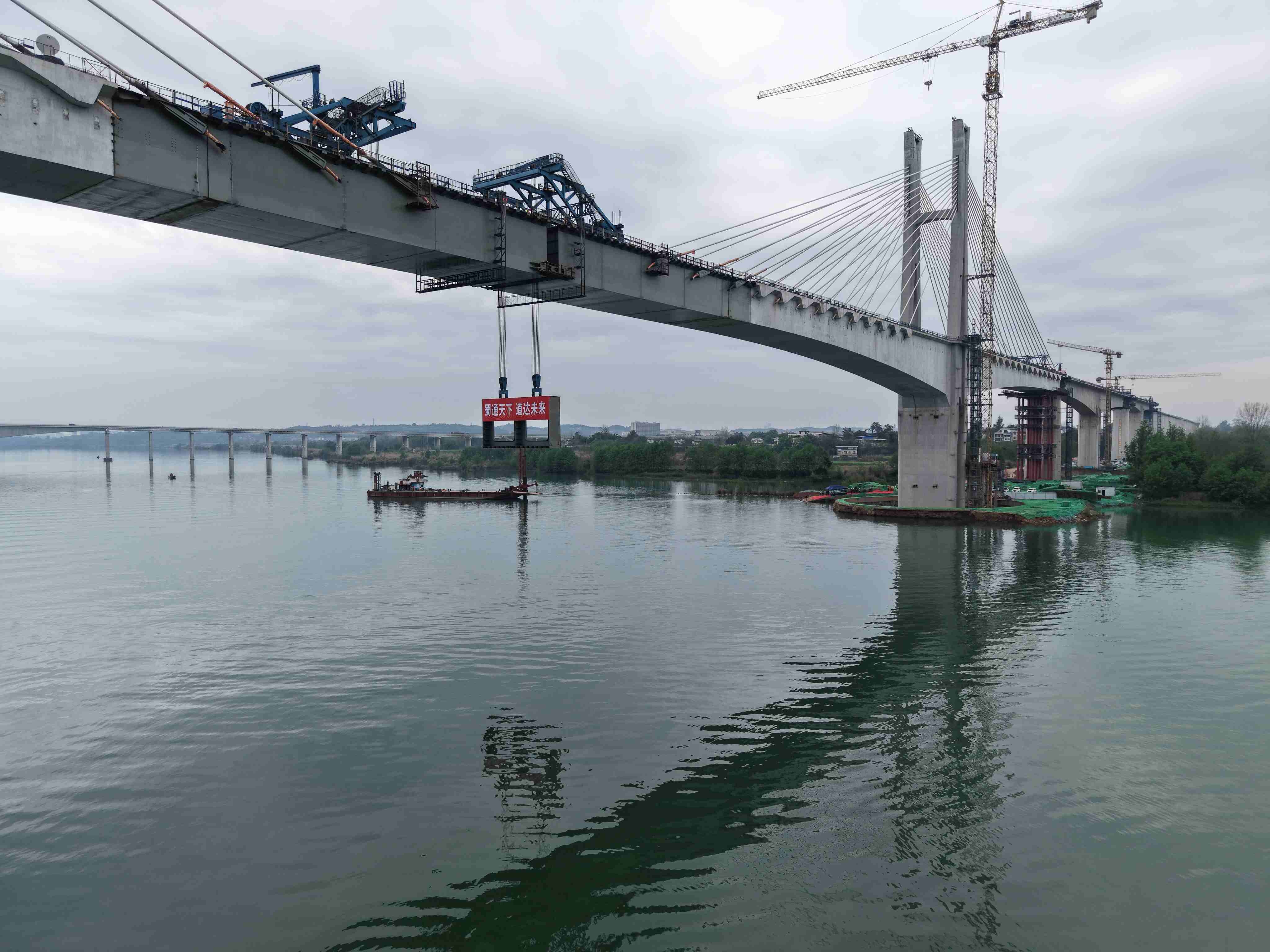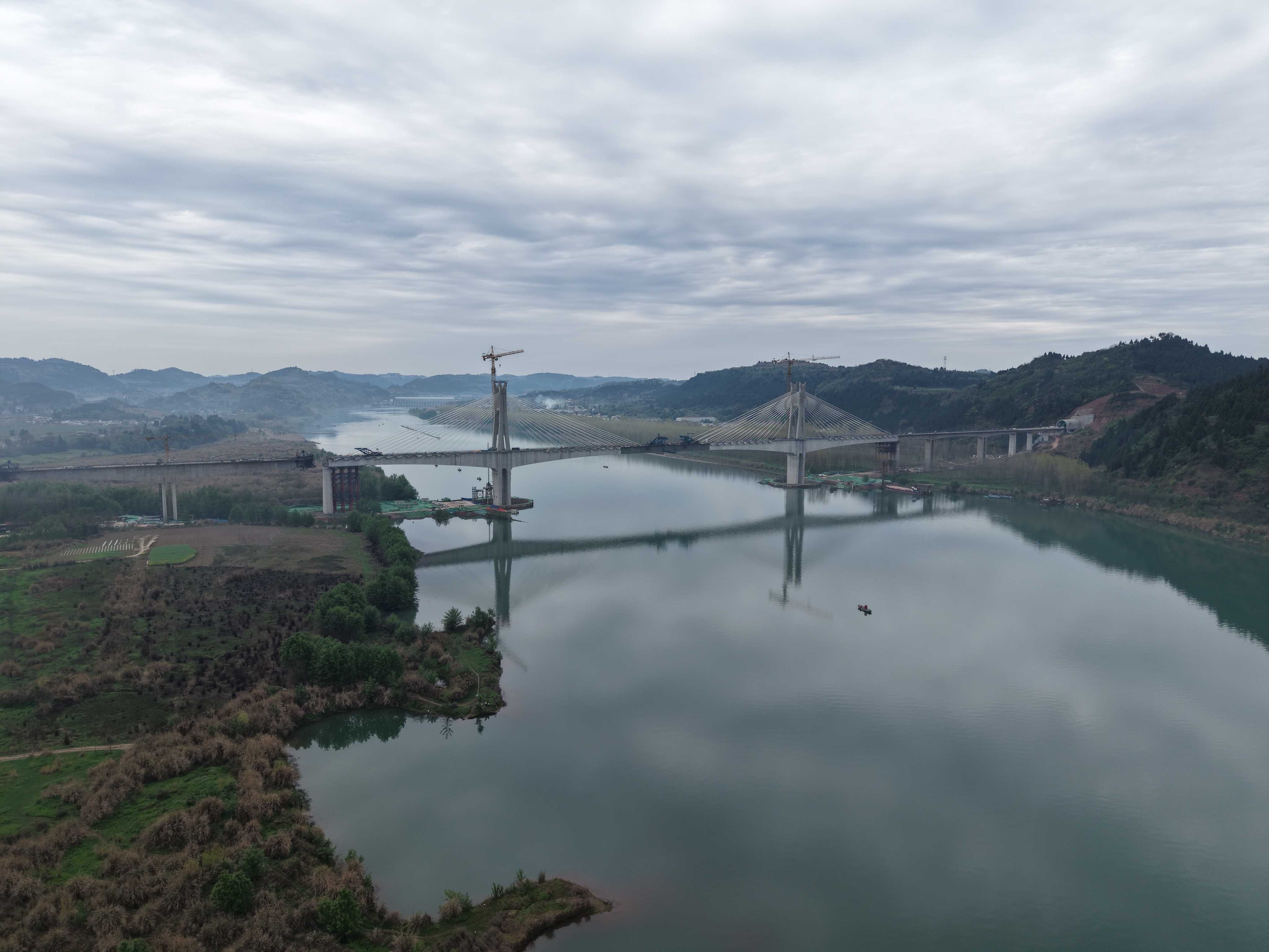 成达万高铁是我国“八纵八横”高铁网沿江通道的重要组成部分,正线全长477公里,设计时速350公里。嘉陵江特大桥位于南充市顺庆区与高坪区交界处,是全线“四桥三隧”重难点控制性工程之一,全长6830米,主桥为“H”形特殊结构双塔双索面钢混结合梁斜拉桥。