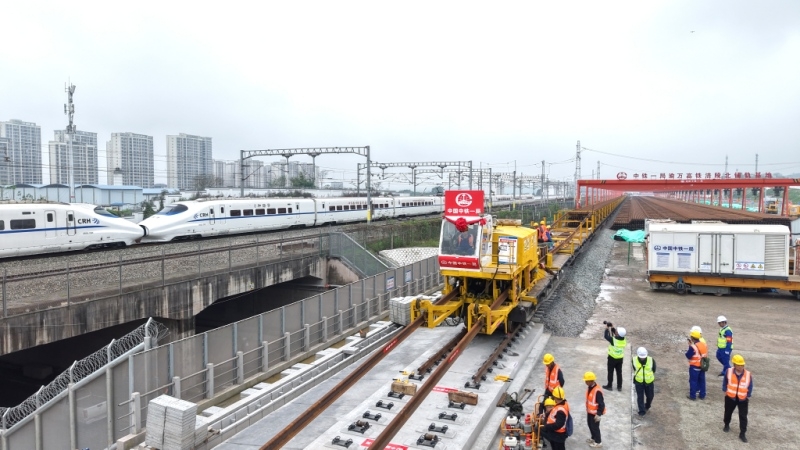 4月3日,在重庆市涪陵区涪陵北站施工现场,中国中铁旗下中铁一局将首对500米长钢轨平稳铺设在无砟轨道道床上,标志着新建重庆至万州高速铁路(简称渝万高铁)正式进入铺轨施工阶段。