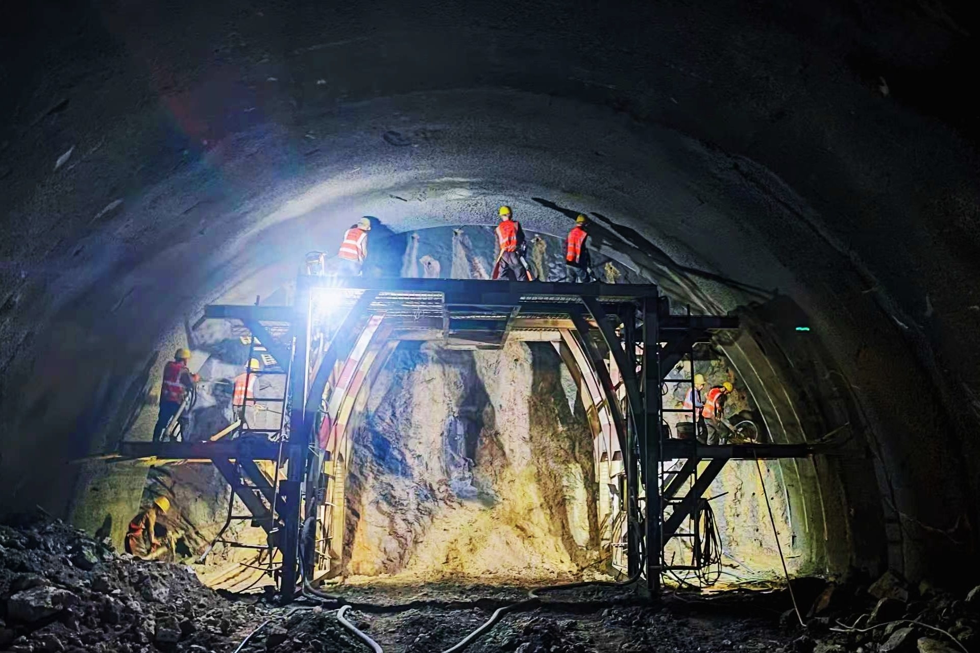 青杠林隧道是全线控制性工程之一,左洞全长626米、右洞全长620米,最大埋深约120米,局部最浅埋深约3米,属于典型的分离式较小净距隧道,沿线溶腔发育、地质构造复杂,生态环保要求高,围岩变形控制难度大。施工过程中,项目团队采用地质雷达、超前钻探等技术精准探明地质条件,动态优化施工方案;应用“管棚+小导管注浆+型钢拱架”联合支护体系,克服浅埋段和溶腔密集区施工难题;引入隧道施工智能监控系统,保障隧道开挖、初期支护、出渣与二次衬砌等工序安全高效衔接。