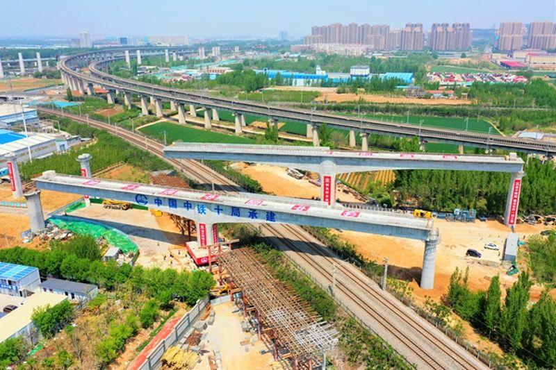 4月20日上午,中铁十局青岛公司承建的济(南)郑(州)铁路济南上行联络线、下行联络线转体桥同时跨越京沪铁路和水(屯)白(马山)铁路,顺利对接,成为济郑铁路首座实现双桥同转的桥梁工程。该转体桥为双幅变梁高T型刚构桥,转体长度128米,单幅转体重量为6500吨,转体过程中,两桥实现了不同转角、不等速同转。 张文亮 摄