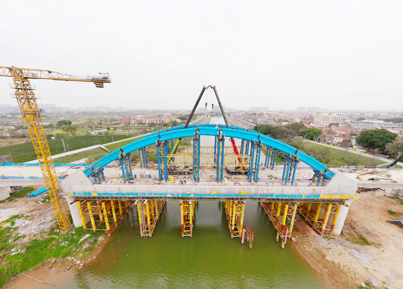 96米提篮拱桥位于佛山市,钢管拱吊装是项目关键环节。项目部精心组织,严格执行施工方案和安全技术规范,建立完善的质量管理体系,对拱肋位置、主垂度等指标进行实时观测,并在合龙前,进行多次实地勘察和技术研讨,对每一个步骤精心计算和反复模拟,确保整个合龙过程严谨而精确。